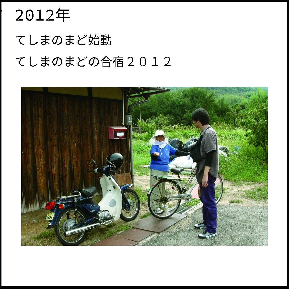 年表 2012年 てしまのまど始動 てしまのまどの合宿2012 中西レモンをお招きし豊島盆踊りのリサーチを開始 2013年 アートスペース「てしまのまど」オープン オープニングプレ企画8月のてしまのまど 〜島歩きワークショップ〜 ゲスト:乗松真也(考古学者/県埋蔵文化センター勤務) スペース「てしまのまど」オープン てしまのまどのアートプロジェクト2013『観光暮らしの光を観る』 助成:福武財団/アサヒビール文化振興財団/中條文化財団 2014年 珈琲の淹れ方やブレンドを楽しむワークショップ「珈琲実験部」 『歩いたり話したりする日』 春の島歩き ゲスト:ゲスト:乗松真也(考古学者/県埋蔵文化センター勤務) 座談会 oue table*「島の暮らしと資本論」ゲスト:渡邊太(社会学者) アーティストインレジデンス招聘作家:吉濱翔 2015年 インタビュー資料集「豊島盆踊り音頭」発行 盆踊りの唄を聞く会 ゲストスピーカー 中西レモン 夏の本のセレクト展 「旅に出て、本を手に入れよ」 ゲスト古書展:なタ書(香川)言事堂(沖縄)ポポタム(目白) 豊島の記憶の記録 (アーティストインレジデンス)招聘作家:藤井光/吉濱翔 出張円盤レコード寄席 ゲスト 田口史人(高円寺円盤) 2016年 珈琲の淹れ方やブレンドを楽しむワークショップ「珈琲実験部」 豊島の記憶の記録 (アーティストインレジデンス)招聘作家:宮脇慎太郎/工藤冬里/藤井光/吉濱翔 展覧会「その島のこと」開催 映画「うたうひと」上映会とトークショー ゲスト:相澤久美(Silent voice プロデューサー) 2017年 出張円盤レコード寄席 ゲスト:田口史人(高円寺円盤) セルフ灸ワークショップ ゲスト: 亀割文子(Moxis) シルクスクリーンワークショップ 珈琲の淹れ方やブレンドを楽しむワークショップ「珈琲実験部」 2018年 繕いワークショップ ゲスト:松本唱子 かご網ワークショップ ゲスト:木村豊一 からだ再発見さんぽ 島歩きと身体のこと ゲスト:濱田陽平(コンテンポラリーダンサー) 出張円盤レコード寄席 ゲスト:田口史人(高円寺円盤) セルフ灸ワークショップ ゲスト;村松直子(てしま鍼灸院) 2019年 喫茶部部長にかねてより運営に携わっていた高木花文が引継ぐ。 その他、東京、横浜、福岡、福島、徳島、香港、マレーシア、韓国などで活動のプレゼンテーションや プロジェクトにおいて制作した藤井光 映像作品「暗唱の家」の上映会を開催。 東京、横浜の情報 |